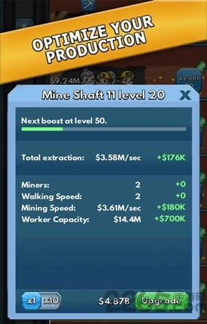 升级电梯运输系统以及地面运输工人,总共需要消耗480个金币;升级后能够提升运输速度、增加单次运输量,还可以扩充运输工人的数量等。玩家只要积攒够对应的金币,就能启动升级流程。当经理的头顶出现小锤子图标时,点击该图标就能让正在开采的矿工进入加速状态,但加速效果仅持续60秒。无论是黄色矿工的箱子、电梯的运载空间,还是地面推小车矿工的装载容器,它们的最大容量都是1000个金币。