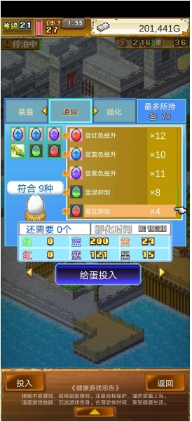 使用蛋红抑制、蛋绿抑制、玉米、两份蛋蓝提升、一份蛋紫提升,再用蛋催光来进行孵化。
