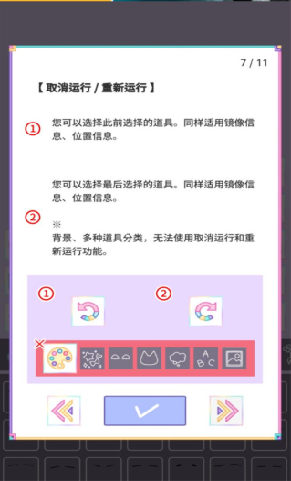 取消运行/重新运行:可以选择之前使用过的道具,但背景以及多种道具分类不支持此操作。