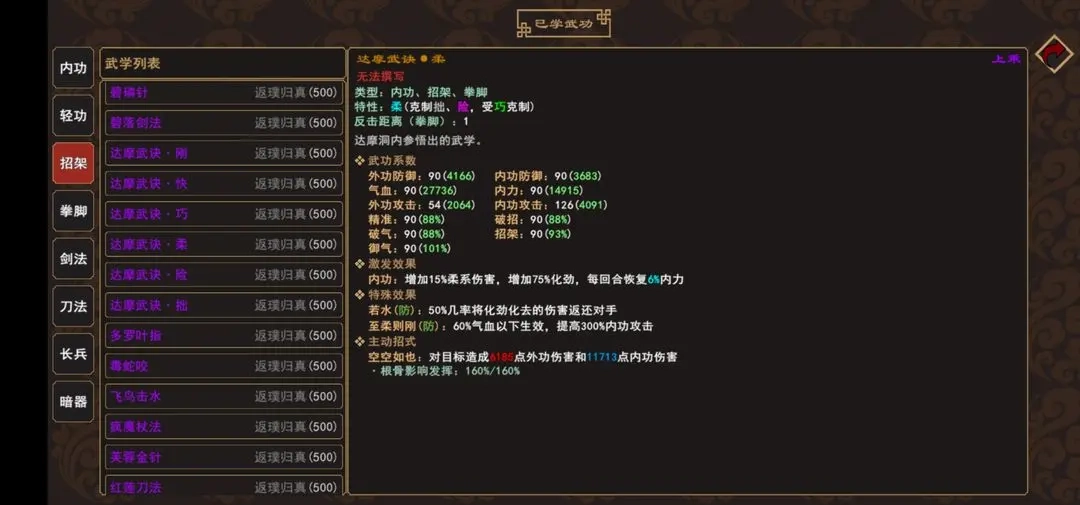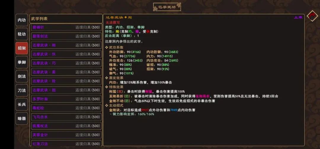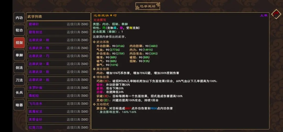 没啥好说的,这数值简直是老怪物级别,效果也太变态了。具体的可以参考下面的图。要是达摩洞那几个老和尚的内功搭配上洗髓功,你们这些人进洞还能参悟出什么白玉汤来?【点穴手】蓝色品质【无名轻功】紫色品质