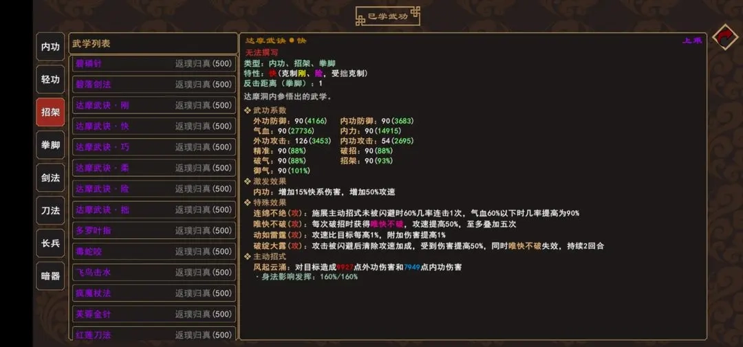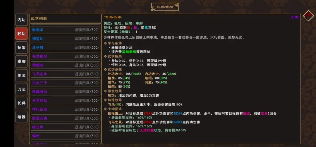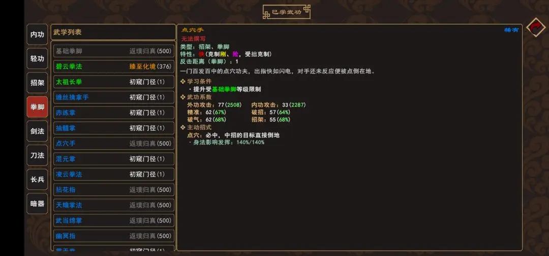 拳脚轻功,有闪避后反击的特殊效果,主动招式必中,还行。