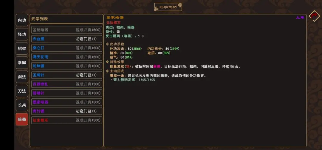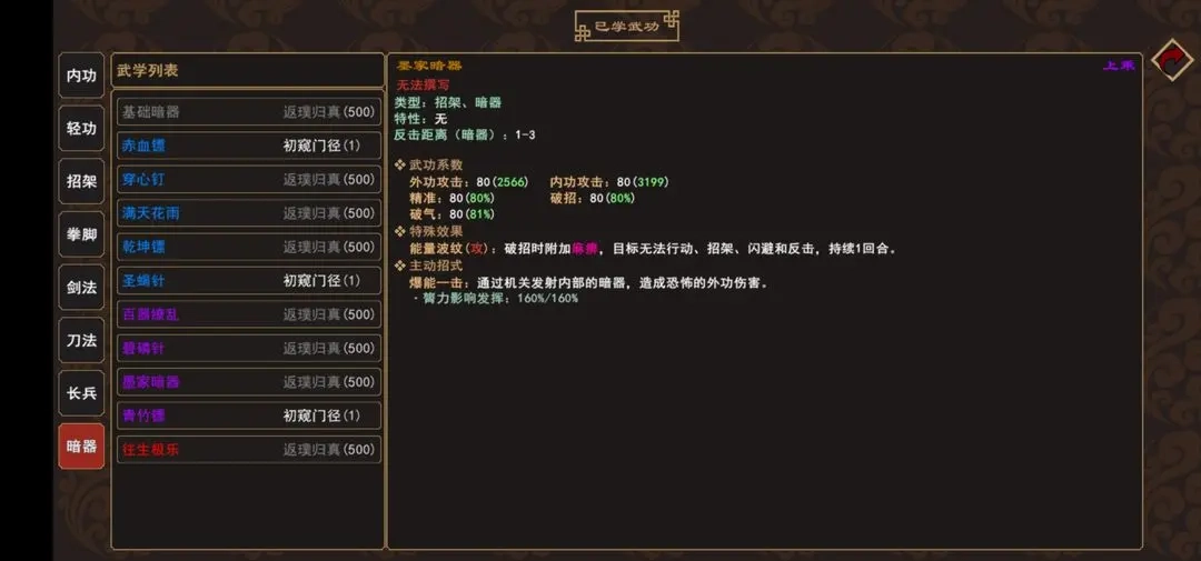 这门暗器武学挺少见的,就是感觉简单了些。墨家不是擅长机关术嘛,那他们的暗器功夫不得弄个绝学级别的?