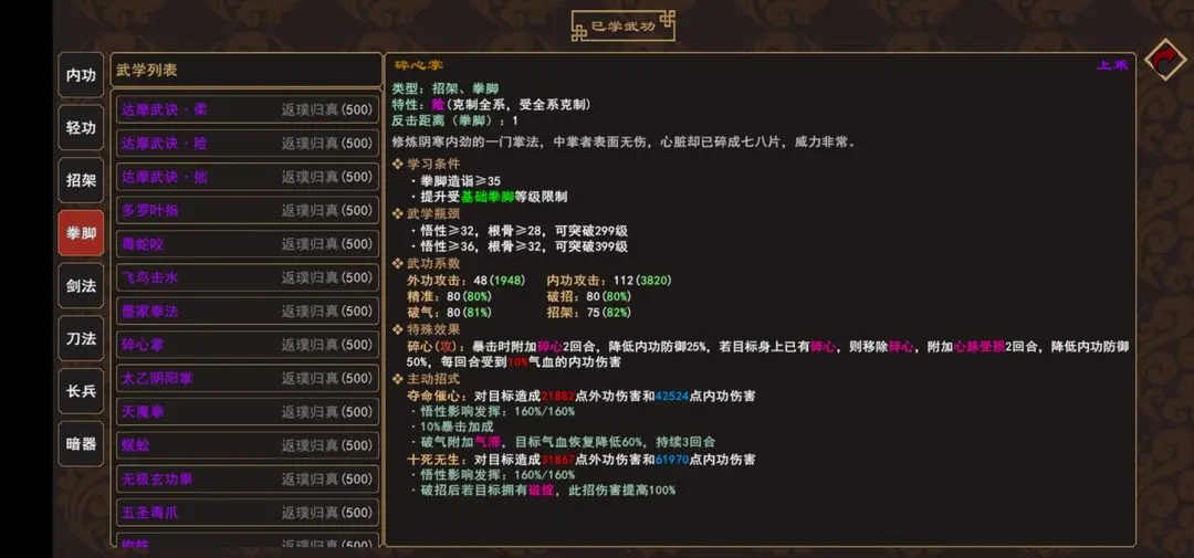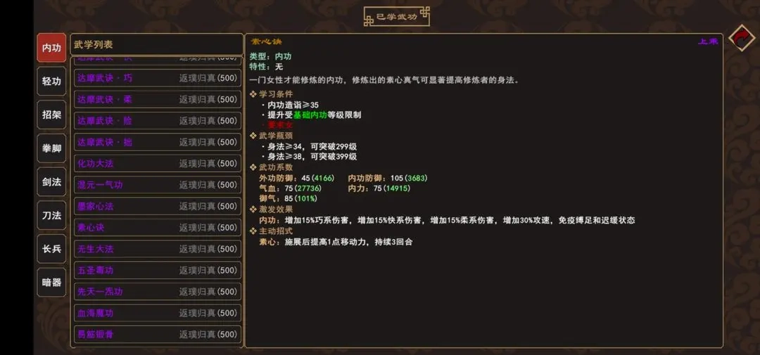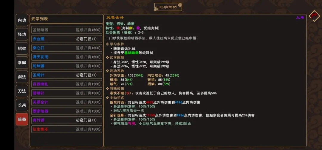 素心诀是只有女性才能修习的内功心法!虽说它只是一门紫色品阶的武学,但至少让女性角色的可玩性又提升了一些(啥时候能轮到女掌门崛起啊)。芙蓉金针属于暗器类武学,表现中规中矩;碎心掌的暴击效果叠起来后,感觉威力相当不错。