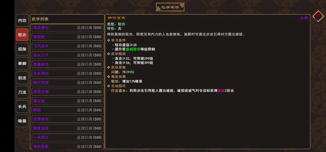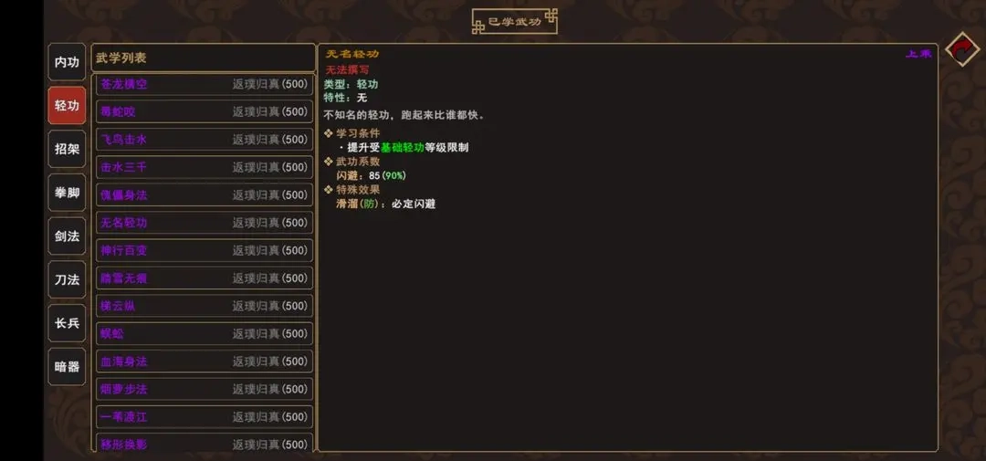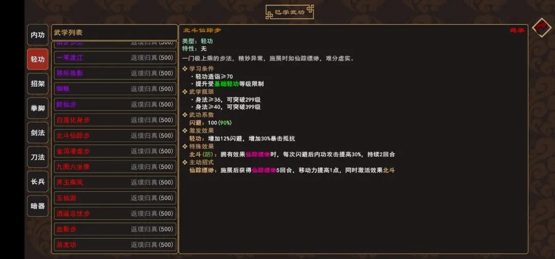 有两种轻功,其中北斗仙踪步的效果还算不错,在高闪避状态下能够增强内功伤害。