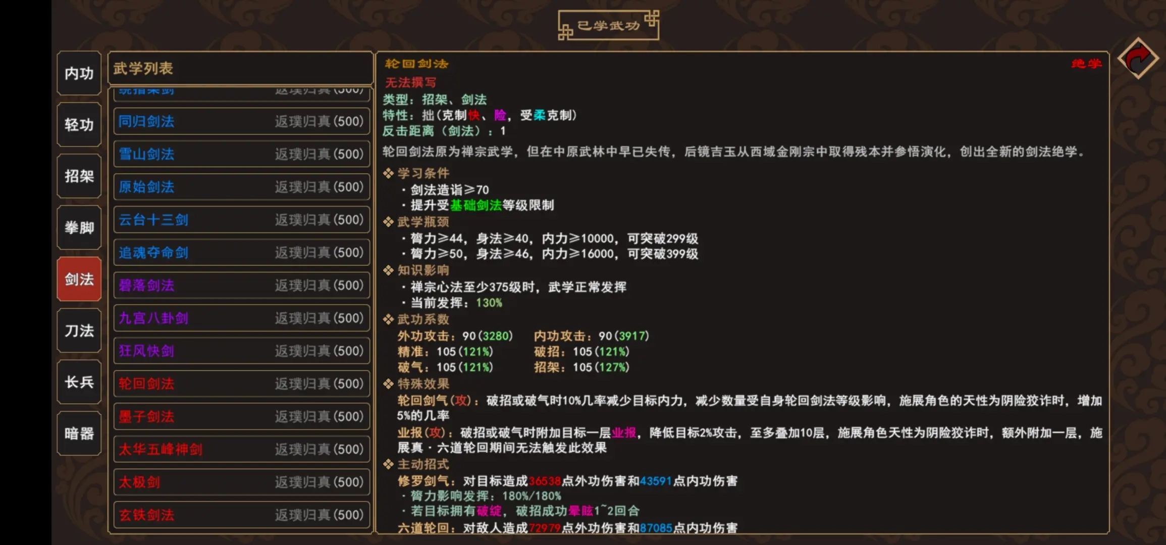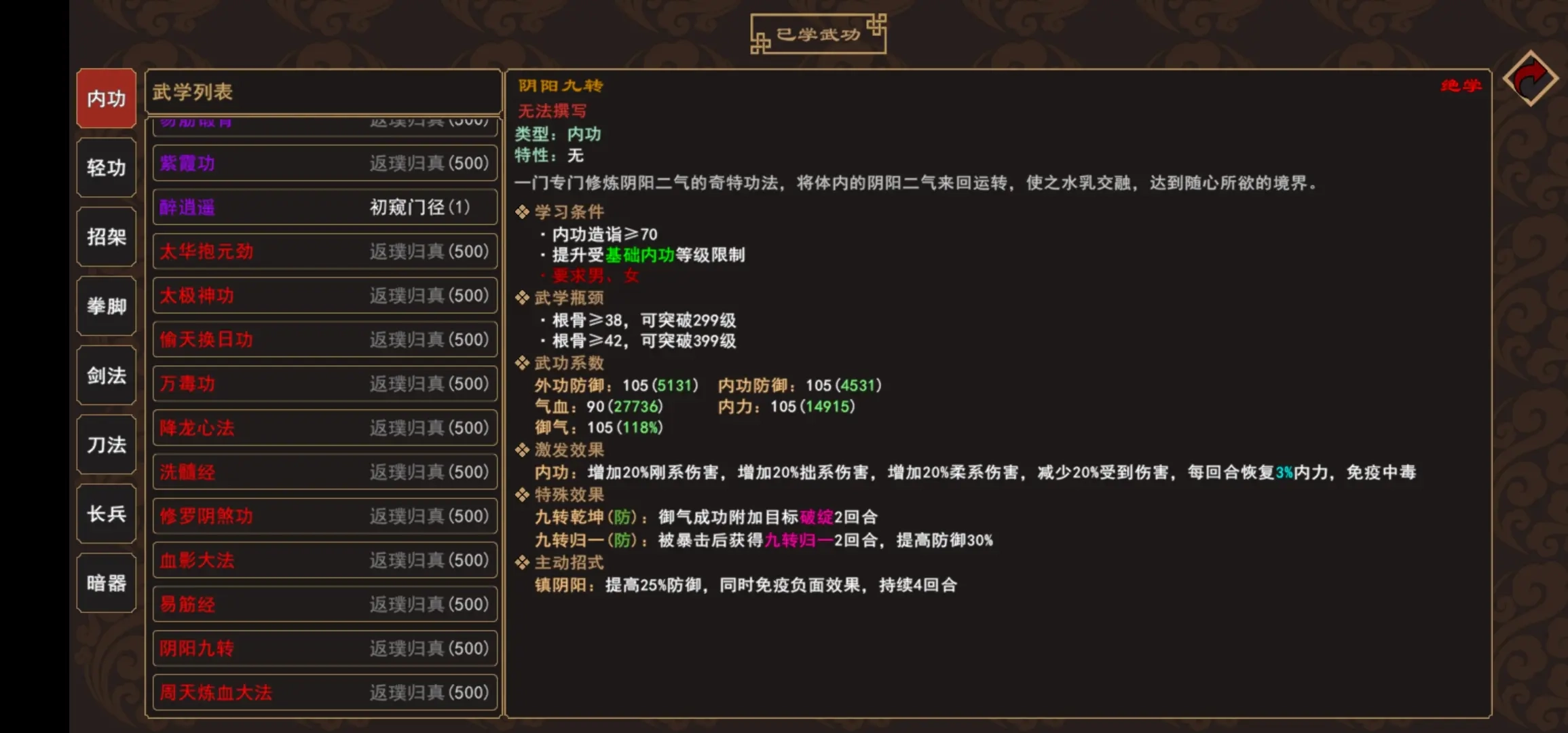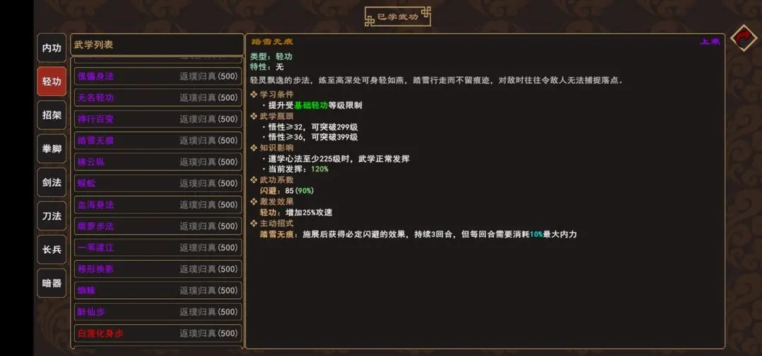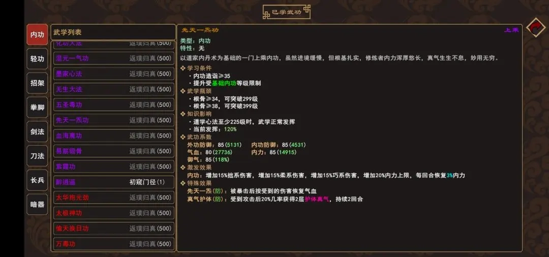 先天一炁内功自带免暴击效果,还会时不时触发防免招式伤害的护盾,每回合自动回复的内力刚好能给踏雪轻功续航,更别提那三回合内百分百闪避的离谱效果了,对付起来实在让人头疼。难怪老林头这么厉害,第一次跟他交手时,我可眼馋这轻功了——这么强悍的轻功,怎么就不是绝学呢?