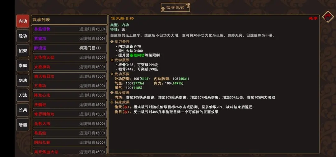 你的攻击我要偷,你的防御我也偷,你的增益我还偷,消耗对方强化己身,越打越强,不愧是能和四大高手多年僵持,一挑四打平的武学。