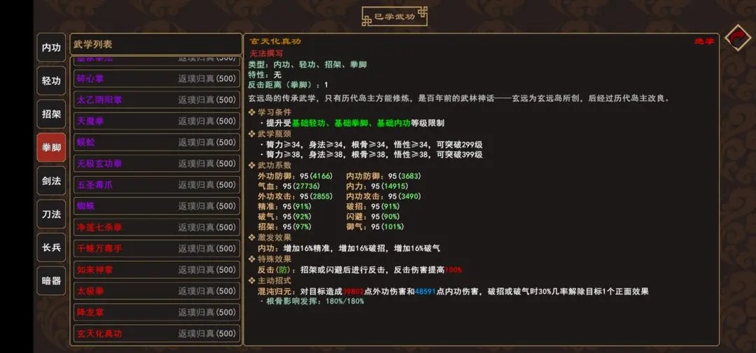 玄远岛的功法是内功、拳脚与轻功融为一体的路子,不过看了具体招式后,感觉和想象中的样子有点差距——没那种能秒天秒地的震撼感,毕竟它的原型侠客岛在设定里可是近乎仙级、超越普通武侠范畴的存在。要是只把它当作单纯的内功来用,和其他武学搭配着使倒也还行;比起别的内功,它虽然少了快、巧这类特性加成,但精准破招、破气的效果加成倒是挺实用的。不过说实话,整体还是觉得差了点意思。
