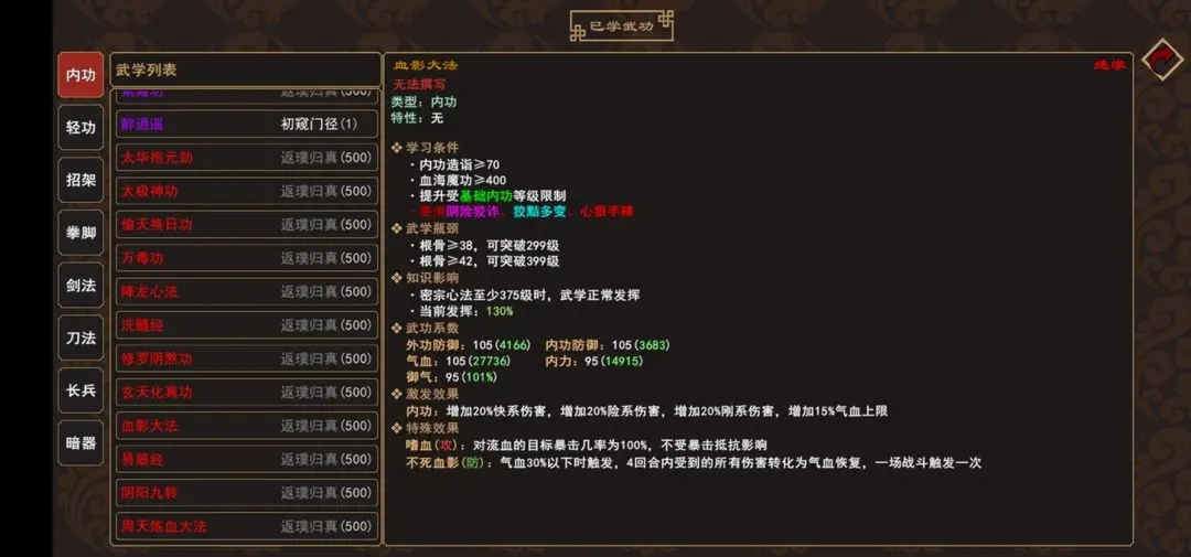 血刀门护法所创的邪功,具备流血即触发暴击的效果,再搭配气血加成以及30%血量以下的续航能力,感觉这套组合与血海刀法相配合时,在续航和伤害两方面的收益,似乎比原来门派的周天炼血内功更胜一筹?