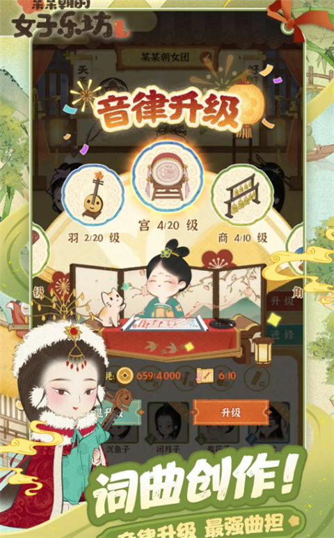 某某朝的女子乐坊游戏,既构建了一个融合古风韵味与多元文化碰撞的架空世界,让玩家在沉浸国风文化的同时,感受模拟经营的趣味;又以清新脱俗的美术风格、生动活泼的角色设计,带来赏心悦目的视觉体验;其经营玩法更具高自由度,玩家可依照个人喜好打造专属的独特乐坊。