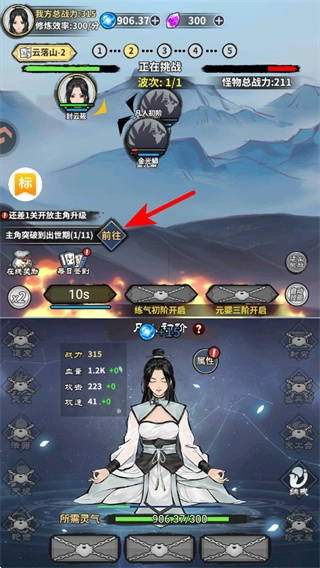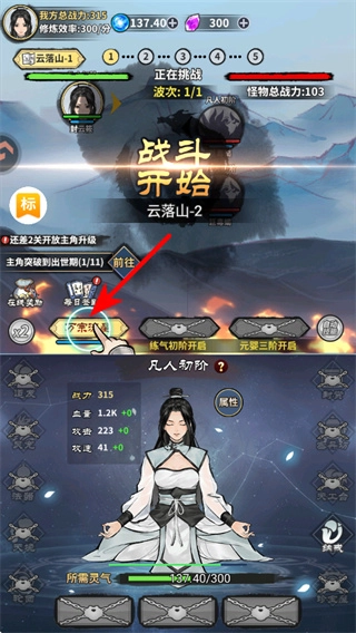 在关卡界面点击对应的战斗触发区域,是进入修真战斗关卡的关键操作,点击后会开启云落山的战斗流程,展开修仙冒险的核心体验。