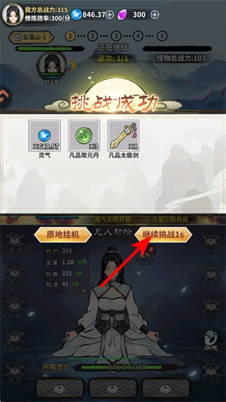 战斗胜利后点击继续挑战按钮,这是推进关卡进度的核心操作,选择后会进入下一个战斗关卡,持续积累资源与提升角色实力,助力成长。