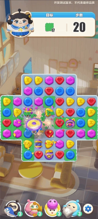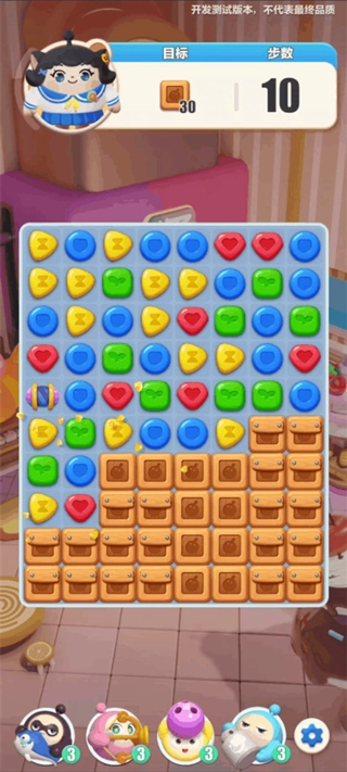 游戏采用经典三消玩法,玩家需消除相同的方块;