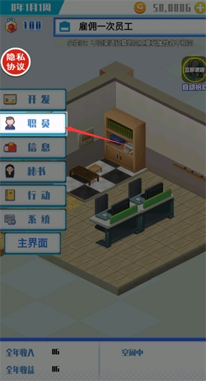 首先点击菜单,在职员一栏中招收一些员工为你工作