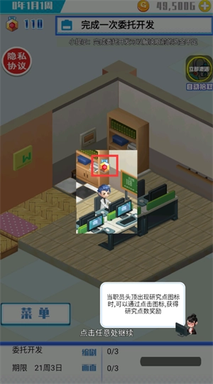 当职员头顶出现研究点图标时,点击该图标即可获取研究点数奖励。
