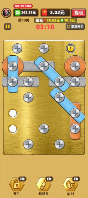 每一个广告都不错过,打螺丝打得很努力,已经玩到14关了,提现比例是1%,总共收入2.62。