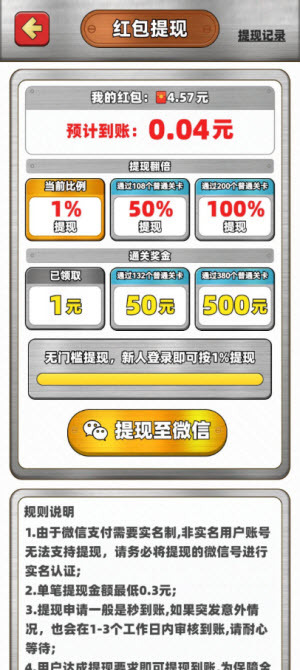 要达到50%的提现比例,得先通过108关,这可太难做到了!
