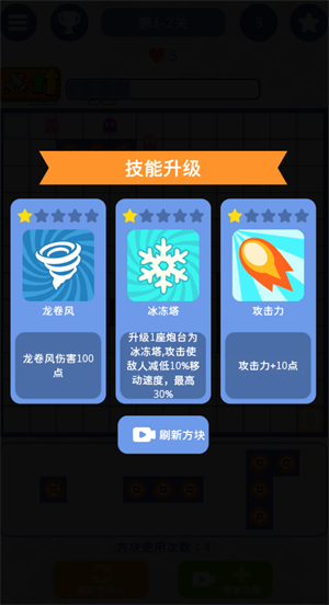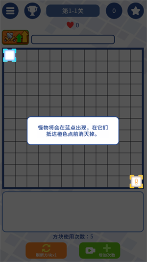 方块布置:玩家需在地图中通过策略性地放置方块,来阻碍怪物的移动路径。