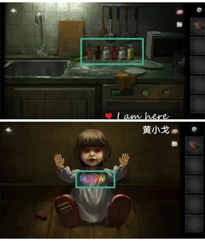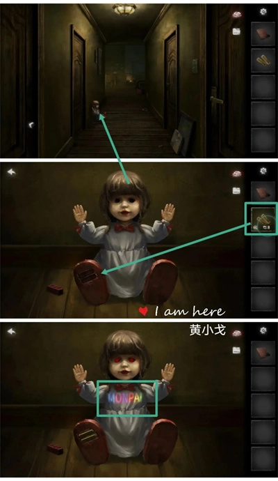 12、(走廊场景)点击玩偶,装入电池后,得到线索信息:MONPAI