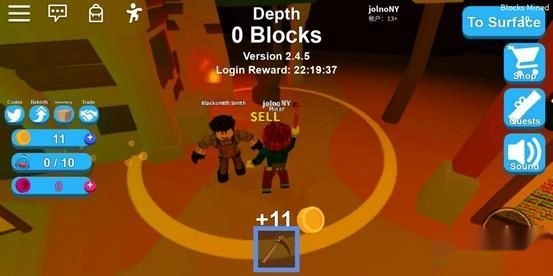 当背包被矿石填满时,我们只需点击界面右上角的传送按钮,就能立刻返回地面。接着找到带有“出售”标识的铁匠,走进他身边的黄色光圈,系统会自动把背包里的矿石兑换成金币,之后就可以再次投入到愉快的挖矿之旅中了!
