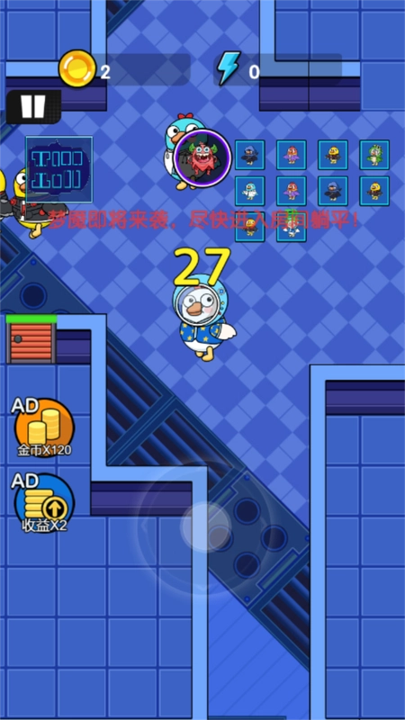 《鹅鸭乐园》是一款色彩缤纷的卡通生存游戏,玩家将化身为鹅或鸭,在充满未知的太空世界里展开生存挑战。这里危机四伏,怪物会随机出现,你需要灵活躲避危险,操控角色找到专属小屋,搭建防御工事来延长生存时间;或是通过淘汰其他玩家提升胜率——记住,稳步发育才是制胜的核心策略,可千万要提防身边的其他人哦!