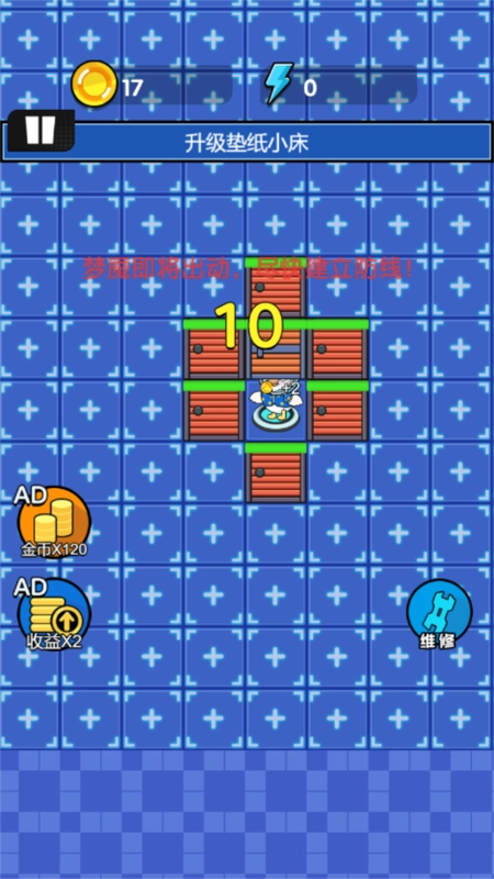1、守护好自己的床铺,借助对资源的合理运用,搭建并升级各类防御设施,以此抵御即将袭来的怪物。