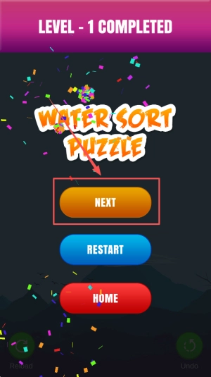 4. 通关进阶:当所有试管里的液体颜色都变得一致时,屏幕上会弹出“LEVEL COMPLETED”的祝贺提示,点击“NEXT”按钮就能解锁新的谜题关卡。