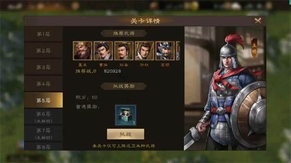2、打法建议:可以直接挑选君主类武将,还有步兵防御类武将,并且要依据关卡的特点来选择适配的兵种。例如在弓兵数量较多的关卡里使用步兵,能显著提高作战效率。