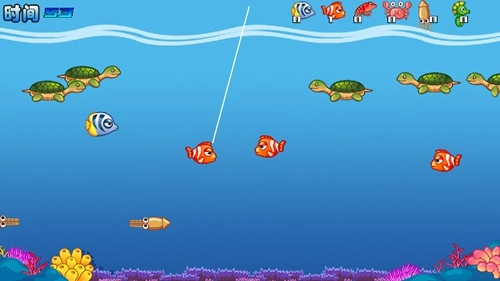 5、钓鱼的操作方式十分简单,我们只需点击屏幕,上方的鱼线便会向下延伸,当鱼线顶端恰好碰到鱼时,就能把它钓起来了。大家多尝试几次,就能轻松掌握钓鱼的技巧。