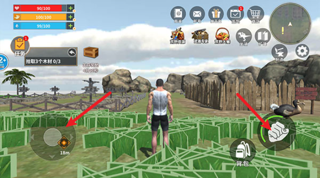 进入游戏后,左侧的虚拟摇杆用于控制角色移动,右侧分布着基础攻击键与背包按钮。