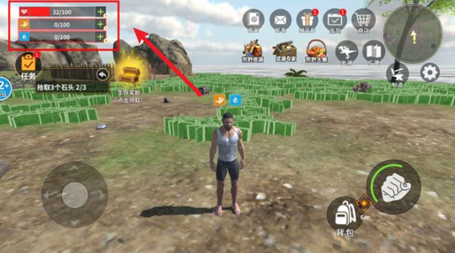 2、要时刻留意自身的饱食度、血量与水分值,这些数值会影响你能否正常行动,其中血量尤为关键,一旦降至零,游戏便会直接结束。