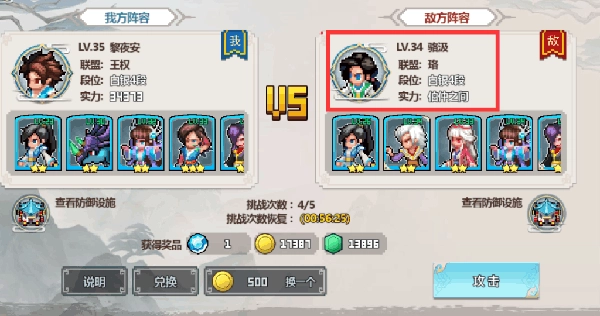 进去之后看到是敌我双方的基本资料,在红框内是地方的等级,名字,段位等,这里重点要介绍的就是实力,虽然没有现实对方的战斗力,但是有字来表示,这个实力有三种:江湖虾米、伯仲之间、高不可攀。相信大家看到的时候能理解个大概了,当然是先挑江湖小虾的玩家先打咯,其次在打伯仲之间的,如果你想挑战一下自己,那就打高不可攀的。Ps如果都打不过,那面有一个500灵币换一个对手选项。