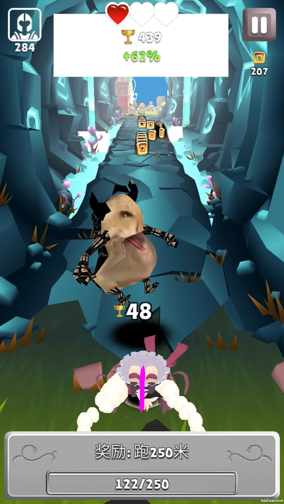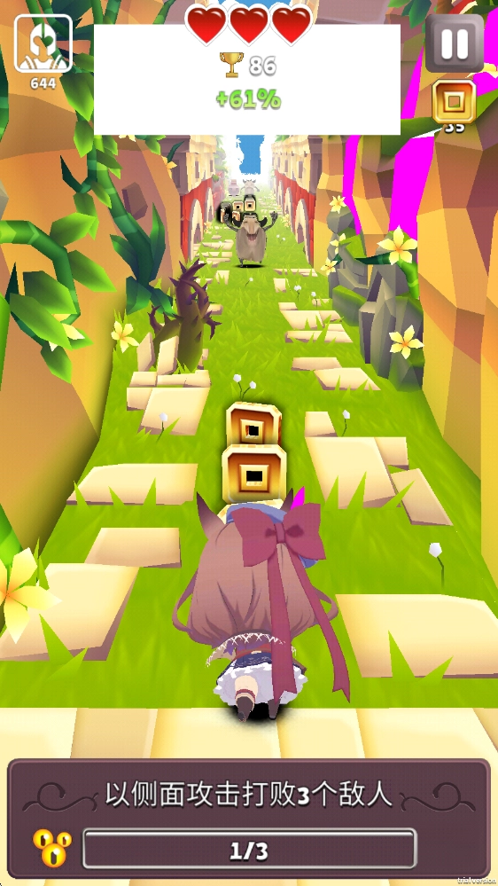 1、动作战斗跑酷:玩家依靠左右滑动来切换方向攻击怪物,同时借助跳跃、滑铲、二段跳等动作躲避障碍。向上滑动跳起后,紧接着向下滑动能够触发“踩踏”动作,以此击杀敌人。当处于高空坠落状态,或者骑乘宠物进行二段跳后向下划动,便可发动范围攻击“大地猛击”。