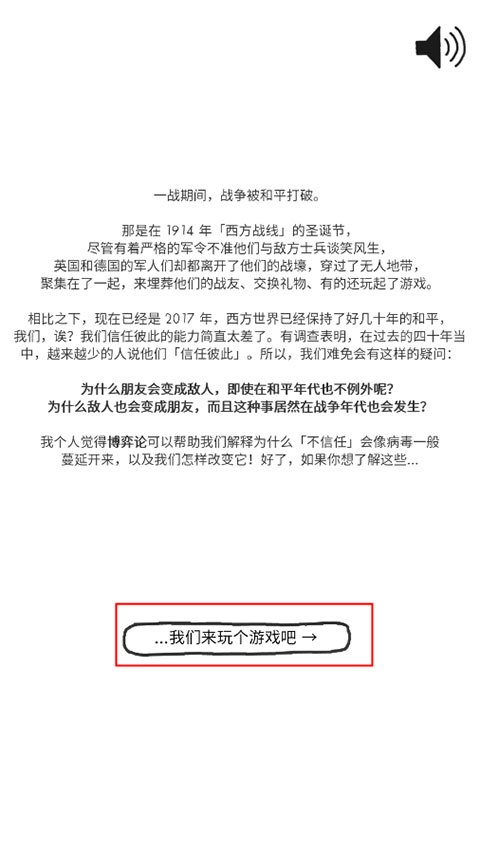 启动游戏后,能看到由游戏剧情设定延伸出的思考内容,接着点击“我们来玩个游戏吧”这个选项。