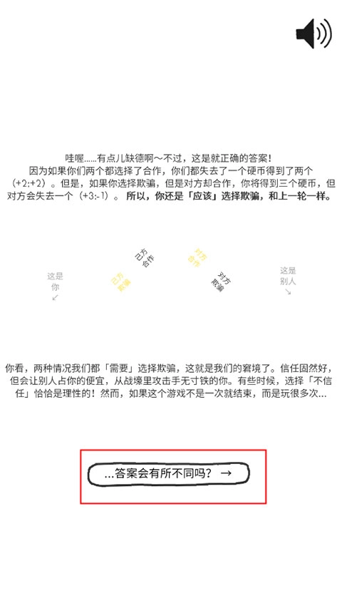 这款以经济学博弈论为理论支撑的休闲益智游戏颇具趣味性,它通过生动刻画社会中的五类典型角色——复读机、小粉红、老油条、黑帮老大与福尔摩星,再搭配理论动画,为玩家呈现了一场足以颠覆认知的奇妙体验。游戏画面简洁清爽,借助简约的动画形式,直观地展现了信任的演变过程,让人们明白每一次关于信任的抉择,都将对后续的发展走向产生深远影响。