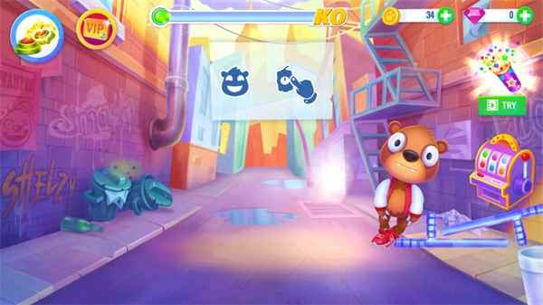 启动游戏程序,进入游戏场景后,你可以对场景中的小熊形象进行任意攻击操作。界面上方的绿色进度条填充完毕时,即表示当前关卡挑战成功。完成关卡后,系统会发放各类游戏内奖励。