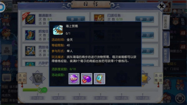 每天都能帮东海湾的商步启做一次货物贸易,完成后能拿到10点活力值。