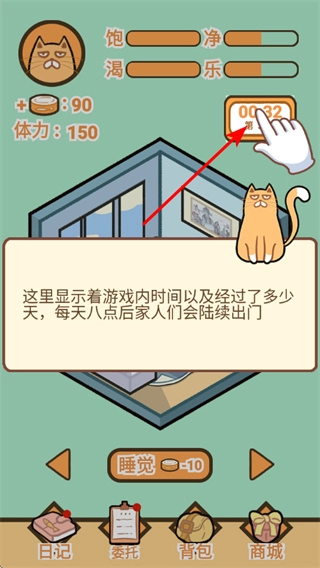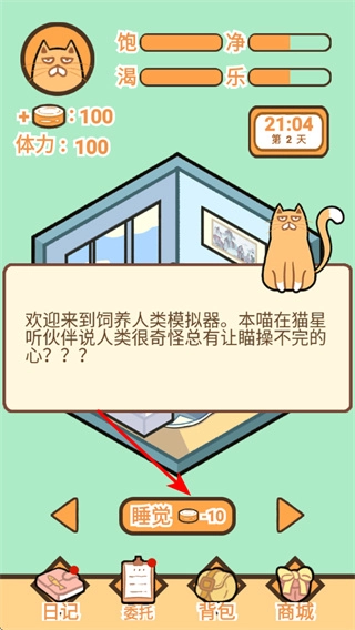 管理猫咪的状态,点击“睡觉”按钮,消耗相应资源让猫咪进入休息状态,以此帮助它恢复体力,同时维持饱食度、口渴度、清洁度、快乐度等各项状态的平衡。