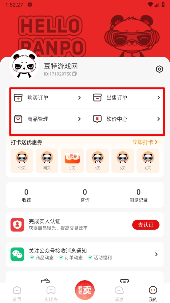 最后在我的页面,可以查看购买的订单、商品管理、砍价中心等功能。