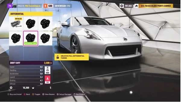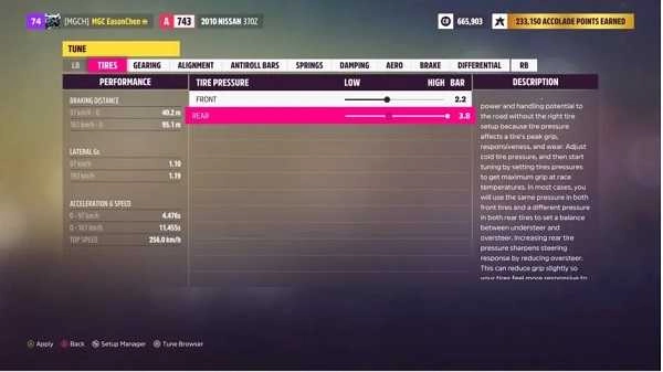 最后一步的关键调整:把后轮胎压调到最大,以此减小轮胎的接地面积,降低抓地力,让车辆更容易起漂。到这里,一辆基础配置但漂移效率很高的战车就正式打造完成了!