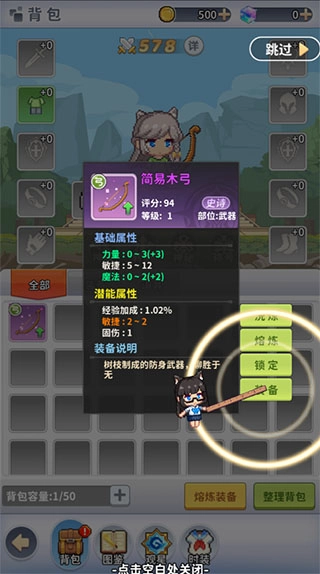 4、刚刚完成新手任务获得新武器啦,点击装备上吧,可以增加自身的各种属性