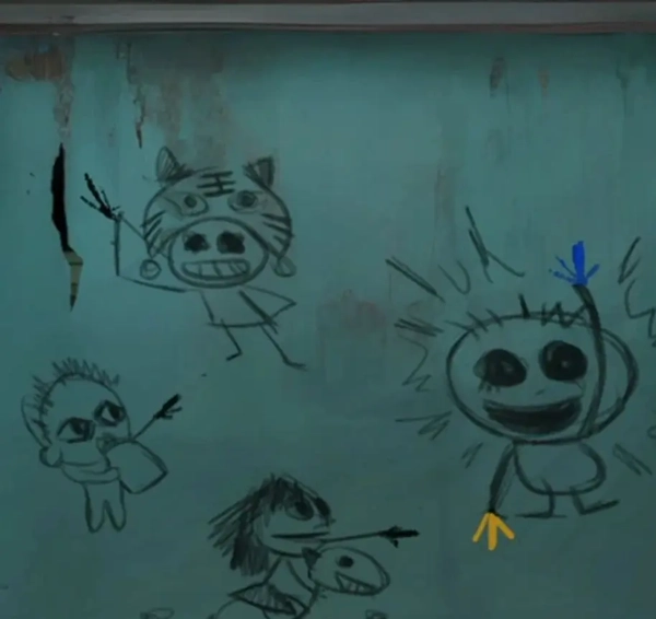 再检查一下左侧的柜子,上面的图案正好和黑板上的图案对应。把【虎头↖】【奶瓶↗】【木马→】【蓝色↑】【黄色↓】这些图案调整好,就能打开下方的柜子,里面有一个【剪纸小人】和一面【锦旗】。这剪纸小人的姿势看着有点熟悉,不就是安全通道标识上那个跑步的小人吗?离开房间后,走廊里触发了老奶奶的剧情,这奶奶看着应该就是言她的盲奶奶吧!不过后面还没玩到,暂时不确定是不是。