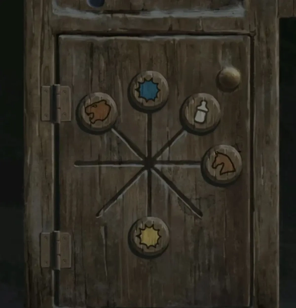 进去之后拉上帘子,这里没有高能场景不用害怕。注意看右边的床上缺了一个探头,后方的墙壁上挂着一幅画,它和左边柜子上的机关似乎存在关联。需要记录一下这些信息:【虎头帽↖】【奶瓶↗】【骑木马→】【蓝色↑】【黄色↓】。由于这些标识里的手指并非全是箭头形状,所以是依据手指伸出去的方向来记录的。