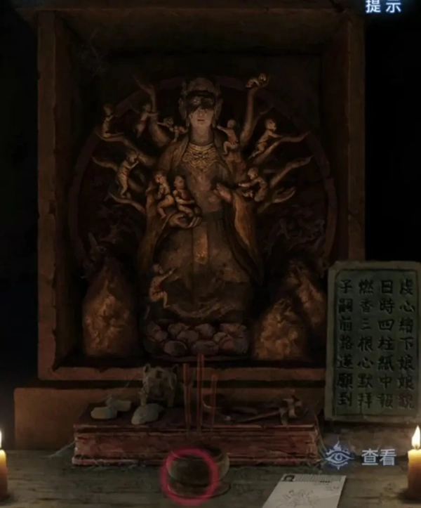 临摹完成后,注意别被窗户后面的小高能吓到。等小高能过后就可以下楼,走到走廊尽头送子娘娘所在的位置。先把【画像】放在桌子上,再对着中间的香炉使用【三炷香】,就能触发剧情了——剧情里有小高能,记得留意。完成这些后,第一章就结束啦~