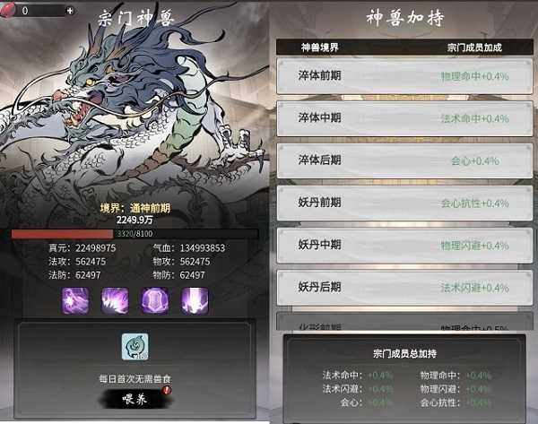 守护宗门的神兽需要时常喂养,小师妹每日都会跑去和神兽聊天。待神兽提升境界,便会为宗门内的众多弟子赋予多项能力加持呢!
