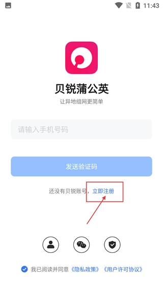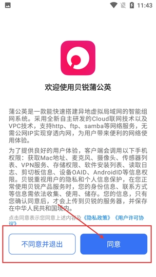 打开贝锐蒲公英应用后,首先要阅读权限说明和相关协议,之后点击【同意】按钮,授予必要的权限,这样才能进入应用的后续流程。