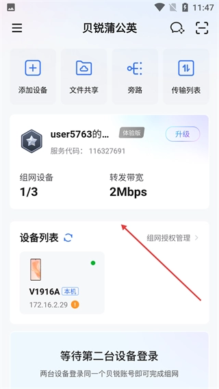 进入主界面后,能够查看组网设备、转发带宽等相关信息,借助【添加设备】等功能可以完成异地组网操作,只需多台设备登录同一个账号就能实现组网。