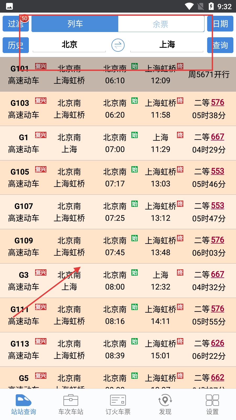 在列车查询页面,选定出发地【北京】与目的地【上海】之后,点击列车列表里的具体车次,比如【G101】。