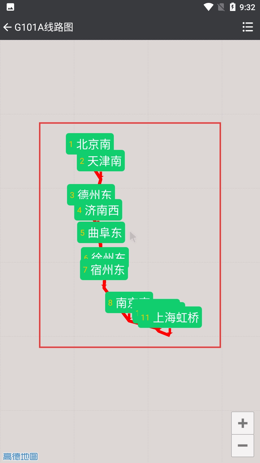 在【G101A线路图】页面,能直观查看列车所经站点,像【北京南】【天津南】【上海虹桥】之类,便于清晰掌握线路走向。