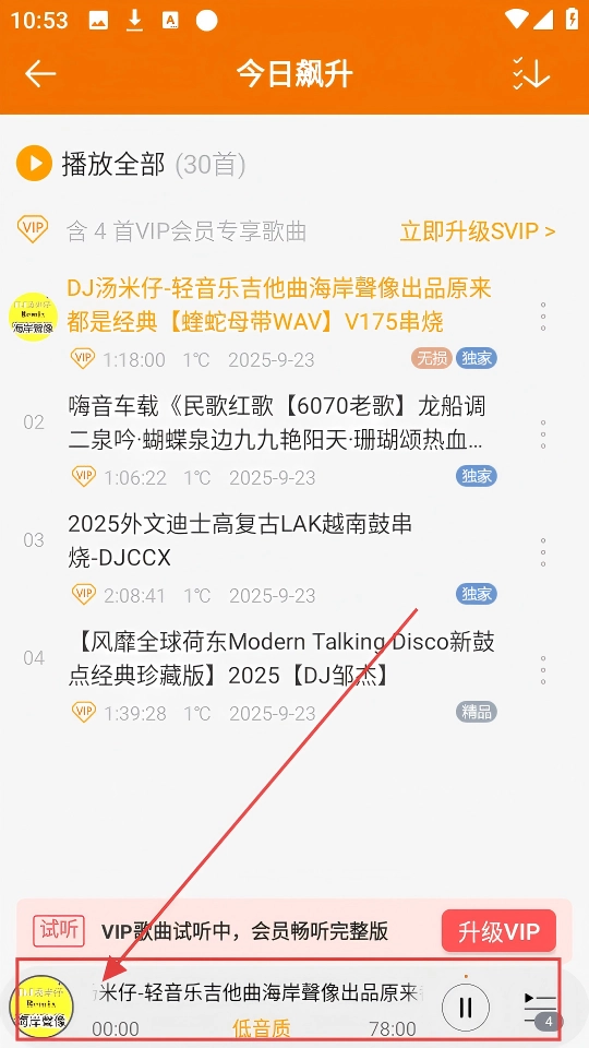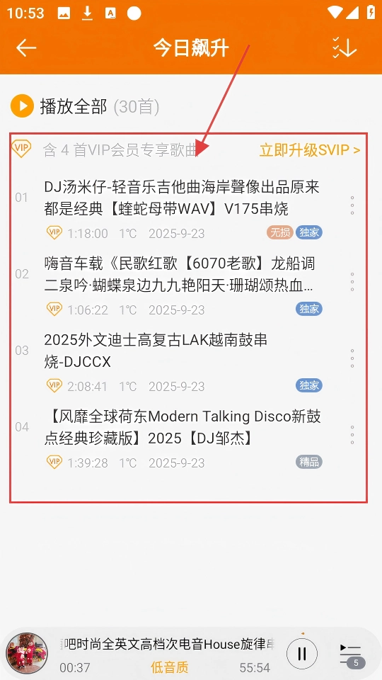 进入【今日飙升】页面,就能看到多首热门歌曲,同时还有VIP专享歌曲的提示,您可以挑选喜欢的歌曲进行试听。