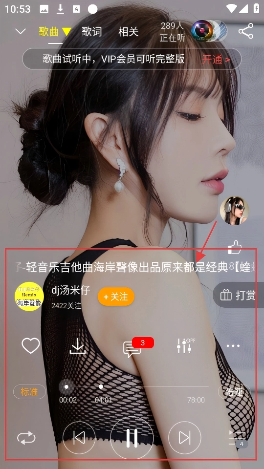 选中心仪歌曲后点击就能试听,要是碰到VIP歌曲,会显示“试听中”的提示,会员可以收听完整版,这样就能方便地了解歌曲内容了。